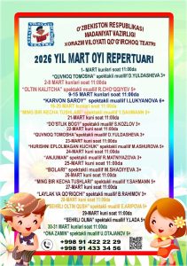 2026-yil 24-fevral kuni Xorazm viloyati qo’g’irchoq teatri tomosha zalida Xiva tumanidagi MTTlardan tashrif buyurgan bolajonlar uchun teatr repertuaridagi eng sara spektakllar namoyish etildi. Sarguzashtlarga boy va qiziqarli sahna asarlari tomoshabinlarga katta taassurotlar bag’ishladi.