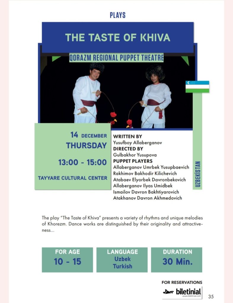 Xorazm viloyati qòģirchoq teatri bir guruh ijodkorlari Turkiya Respublikasining Bursa shahrida 2023-yil 11-16 dekabr kunlari òtkaziladigan «XX Xalqaro Bursa Qoragòz qòģirchoq va soya teatri festivali»da qatnashish uchun ijodiy safarga chiqishmoqda. Jamoaga oq yòl va muvaffaqiyatli natijalar tilab qolamiz.