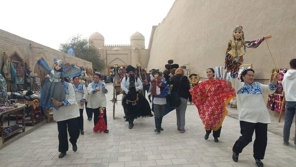 Xorazm viloyati qòģirchoq teatrining yangi loyixasi asosidagi Ichan Qal’a majmuasi bòylab teatrlashtirilgan òziga xos chiqishlari tobora òz samaralarini bermoqda. 27- Oktyabr kuni Xiva shahrining tarixiy markazida teatr tomonidan taqdim etilayotgan «Qòģirchoqlar aravasi» badiiy kompozitsiyati, Xon va saroy a’yonlarining yurishlari xamda milliy folklor tomoshalari mahalliy va xorijiy sayyohlarga namoyish etildi.