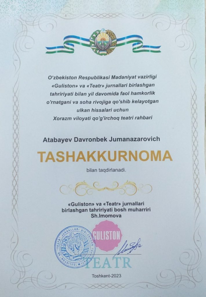 O’zbekiston Respublikasi Madaniyat vazirligi “Guliston” va “Teatr” jurnallari birlashgan tahririyati bilan yil davomida faol hamkorlik o’rnatgani va soha rivojiga qo’shib kelayotgan ulkan hissalari uchun Òzbekiston Respublikasida xizmat kòrsatgan madaniyat xodimi, Xorazm viloyati qo’g’irchoq teatri direktori Davronbek Atabayevni Tashakkurnoma bilan taqdirlashdi.