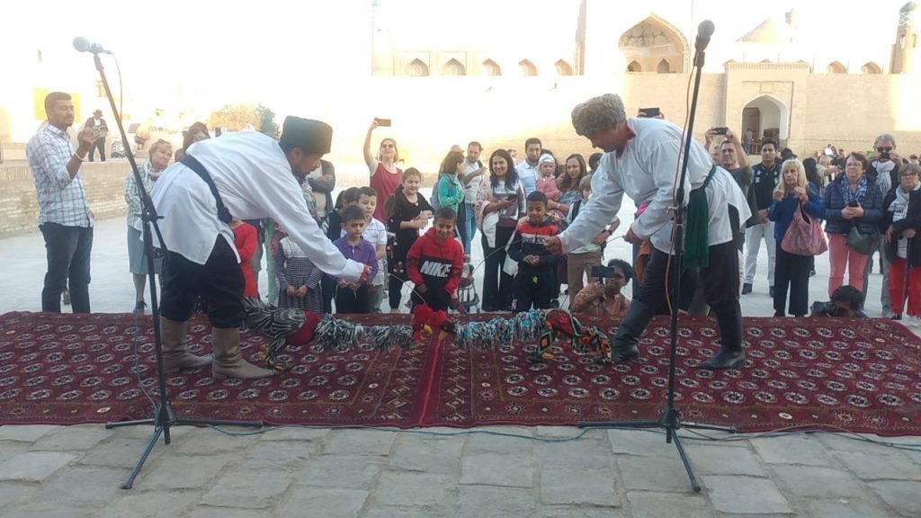 Xorazm viloyati qòģirchoq teatrining yangi loyixasi asosidagi Ichan Qal’a majmuasi bòylab teatrlashtirilgan òziga xos chiqishlari tobora òz samaralarini bermoqda. 23-24 Oktyabr kunlari Xiva shahrining tarixiy markazida teatr tomonidan taqdim etilayotgan «Qòģirchoqlar aravasi» badiiy kompozitsiyati, Xon va saroy a’yonlarining yurishlari xamda milliy folklor tomoshalari mahalliy va xorijiy sayyohlarga namoyish etildi.