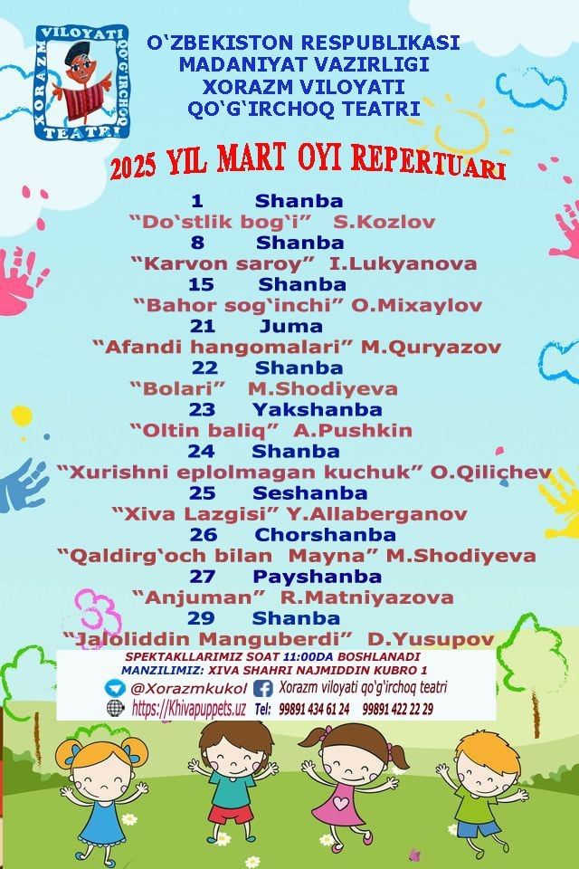 Xorazm viloyati qo‘g‘irchoq teatri bir guruh ijodkorlari Sirdaryo viloyatiga ijodiy gastrol safari doirasida 2025-yil 3-mart kuni Sayhunobod tumanidagi «Jajji bilag‘on» nomli MTTda teatr repertuaridagi I.Lukyanovaning «Karvon saroy» spektaklini namoyish etishib bolajonlarga zavq va ma’naviy ozuqa ulashishdi.